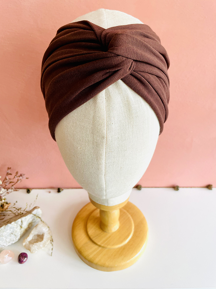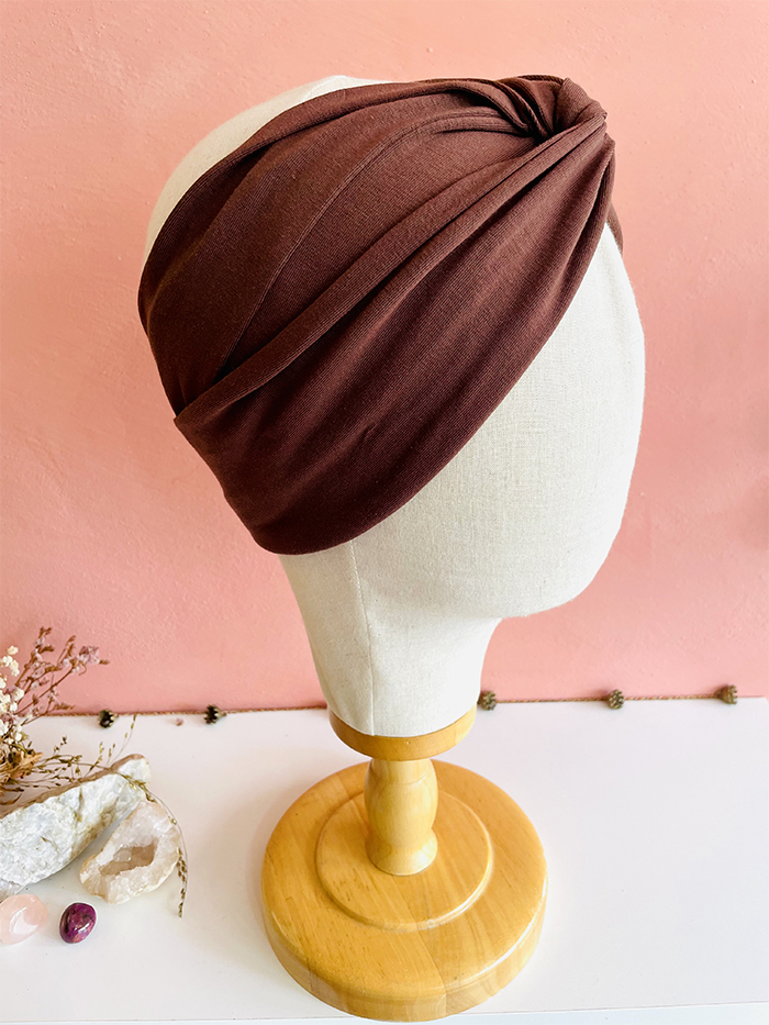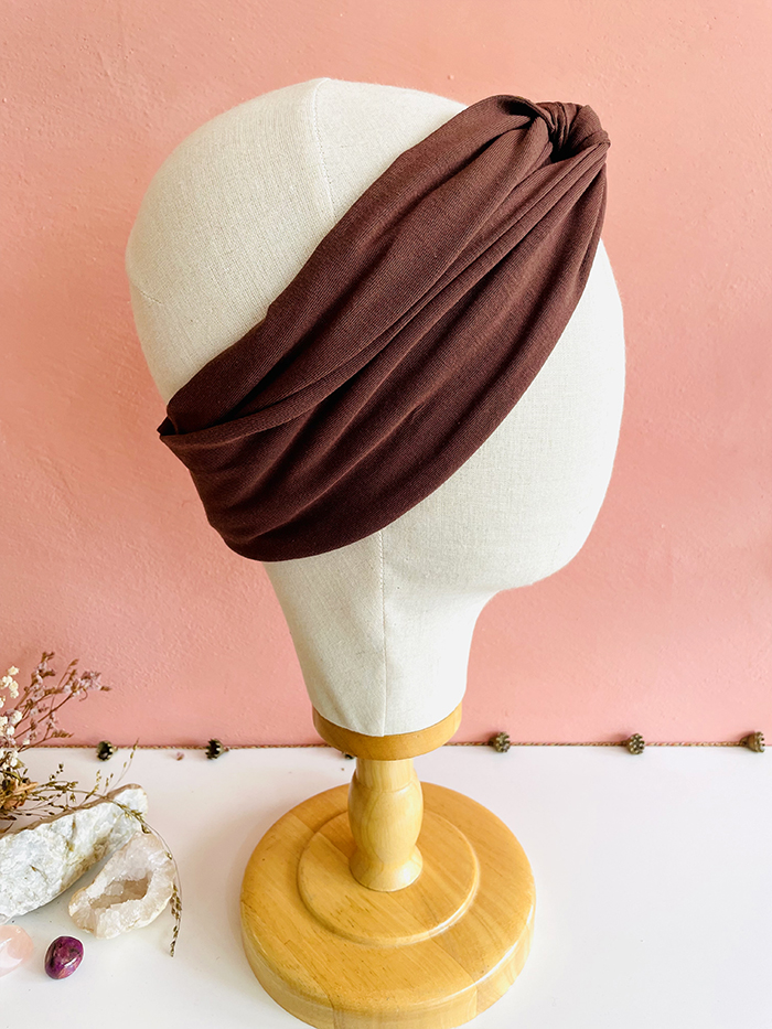 Le bandeau à cheveux en coton bio existe en coloris Marron, Noir, Marine, Caramel, Rose poudré, Paon et Corail.