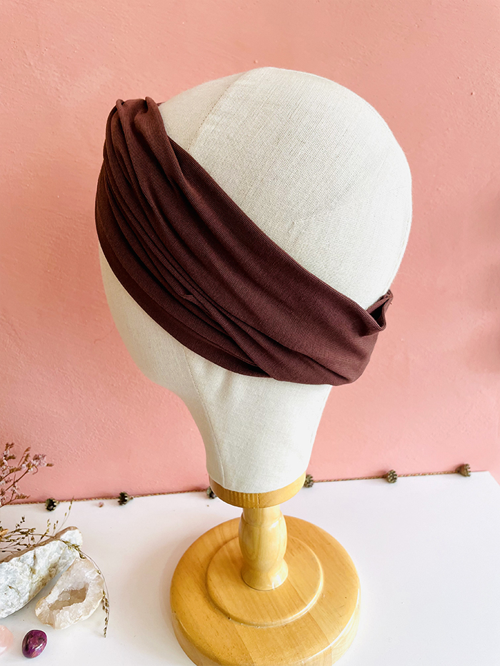 Bandeau à cheveux en coton bio, prêt à enfiler, coloris marron Moka : 95% coton bio, 5% élastanne. Tissu certifié G.O.T.S. et Oeko-tex 100, garanti sans aucune substance nocive pour la peau et le cuir chevelu.