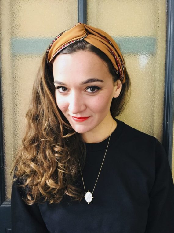 Bandeau à cheveux en tissu satiné 100% polyester, miel, gansé de motif. Elastique recouvert sur la partie de la nuque, effet croisé sur le devant.