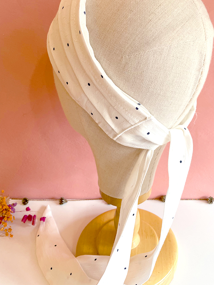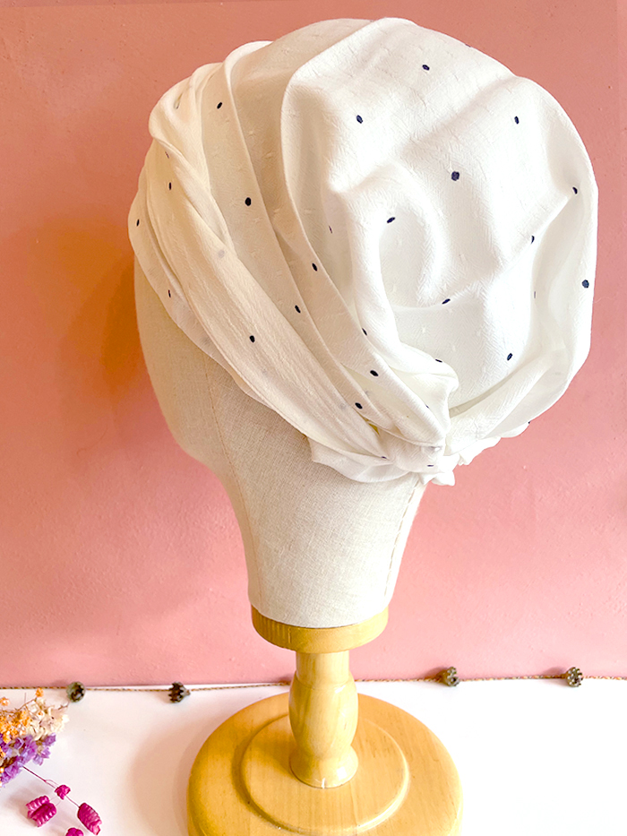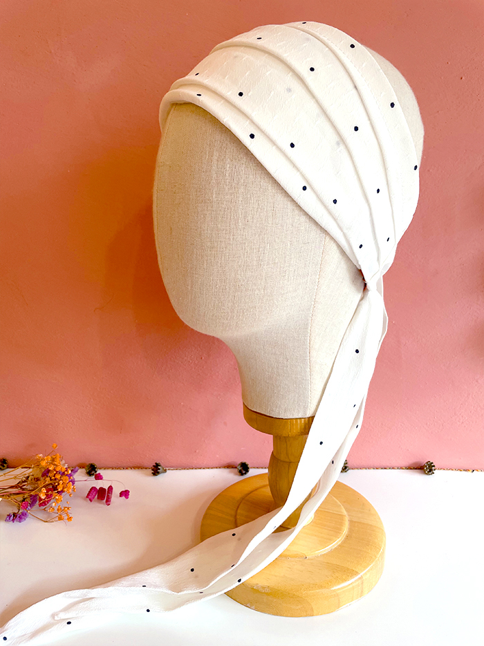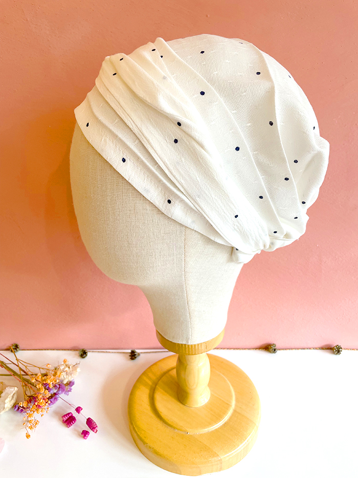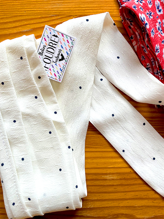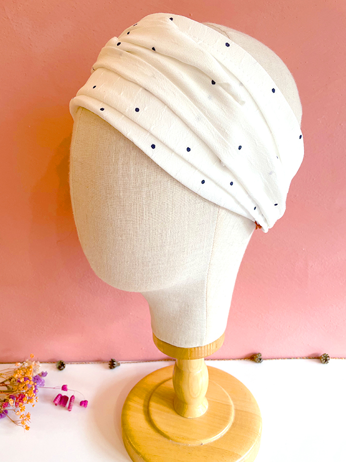 Le bandeau à cheveux à pois blanc apporte du volume tout en douceur. D’abord, il se porte comme un bandeau large. Ensuite, il se transforme en fichu pour couvrir toute la tête. Ainsi, vous adaptez facilement votre coiffure à vos envies, à votre tenue ou à votre besoin du moment.