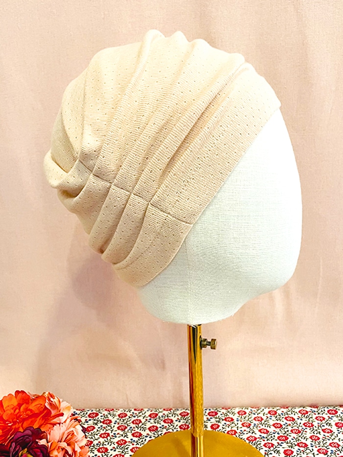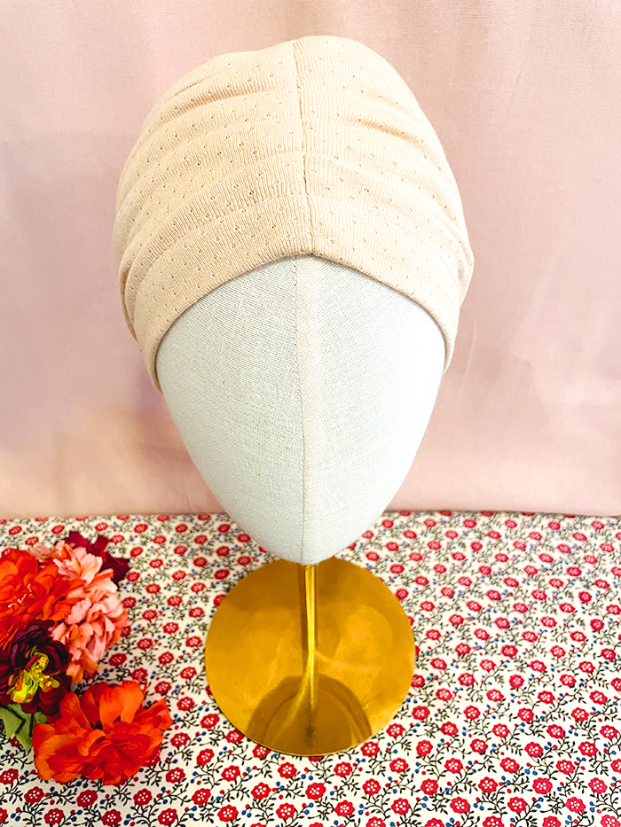 Ce petit bonnet pour pelade et alopécie peut se porter à l’intérieur comme à l’extérieur. Vous pouvez également le porter pour dormir. Il ne serre pas et s’adapte à tous les tours de tête grâce à sa maille extensible. Deux rangées de plis créent du volume. Cela habille la tête pour compenser l’alopécie. Facile à mettre, vous choisissez si vous préférez les plis au milieu de la tête ou bien sur les côtés (voir les photos).