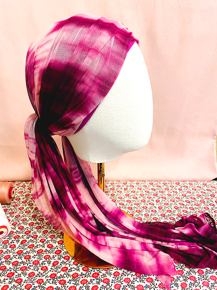 Le foulard anti-glisse est un bandeau chimio très facile à mettre. Il est composé d’un long tissu résille attaché à un bandeau doux et élastique qui s’enfile tout simplement. Vous pouvez bouger, vous pouvez sauter, la tenue de ce bandeau est impeccable dans toutes les situations. A vous de choisir si vous laissez apparaitre le bandeau uni ou si vous le cachez sous le voile.