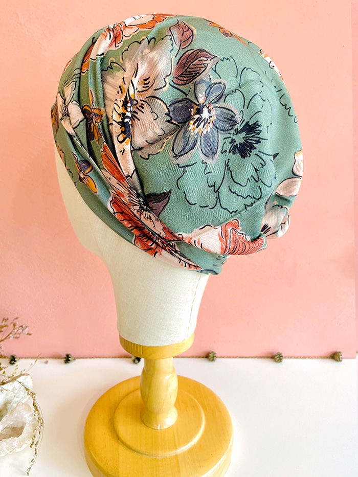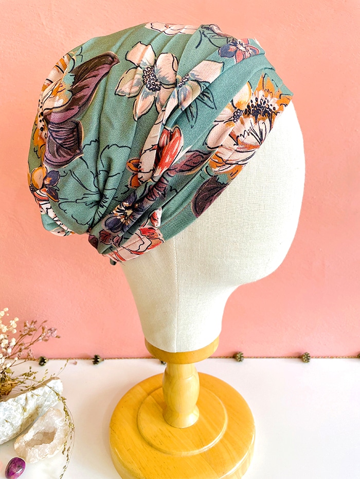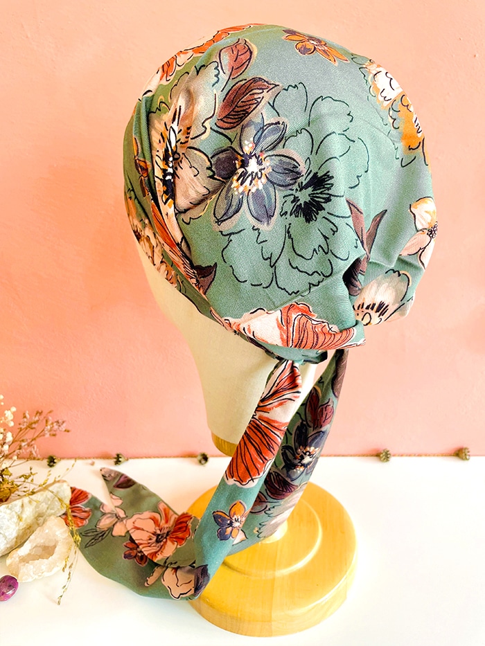 Bandeau pour chimiothérapie, pelade et alopécie imprimé à fleurs « Caroline » en tissu fin et léger : 100% viscose.